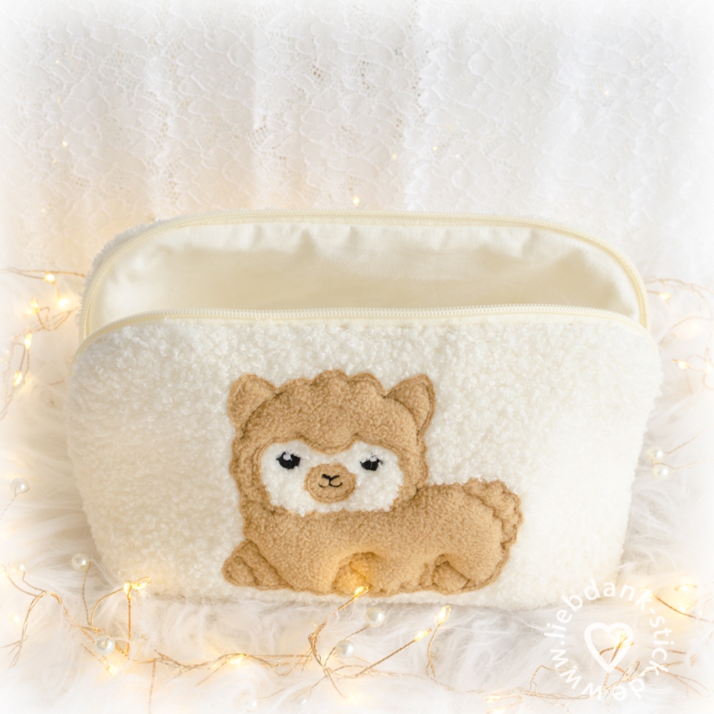 Wichtig zu wissen: Das Gesicht des Alpakas wird nicht appliziert. Das bedeutet, dass die Farbe des Taschenstoffs gleichzeitig die Gesichtsfarbe des Alpakas wird. Deshalb lohnt es sich, einen Stoff auszuwählen, dessen Farbton gut zu einem süßen Alpaka-Gesicht passt.