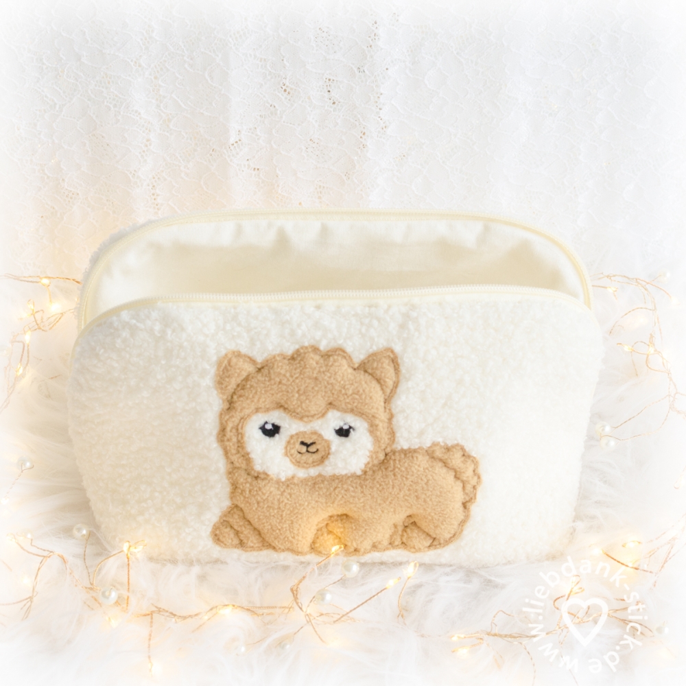 Wichtig zu wissen: Das Gesicht des Alpakas wird nicht appliziert. Das bedeutet, dass die Farbe des Taschenstoffs gleichzeitig die Gesichtsfarbe des Alpakas wird. Deshalb lohnt es sich, einen Stoff auszuwählen, dessen Farbton gut zu einem süßen Alpaka-Gesicht passt.
