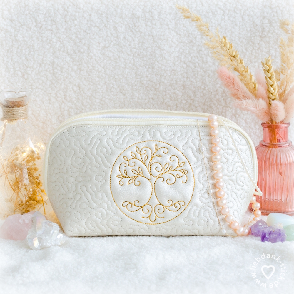 Diese hübsche Kosmetiktasche wird teilweise mit der Stickmaschine angefertigt und am Schluss mit der Nähmaschine genäht. Eine Schritt für Schritt Anleitung ist dabei.