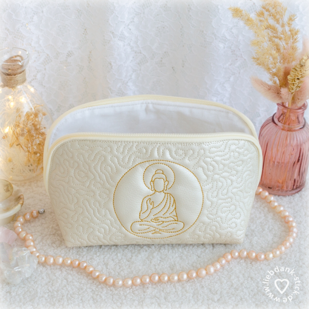 Diese hübsche Kosmetiktasche wird teilweise mit der Stickmaschine angefertigt und am Schluss mit der Nähmaschine genäht. Eine Schritt für Schritt Anleitung ist dabei.