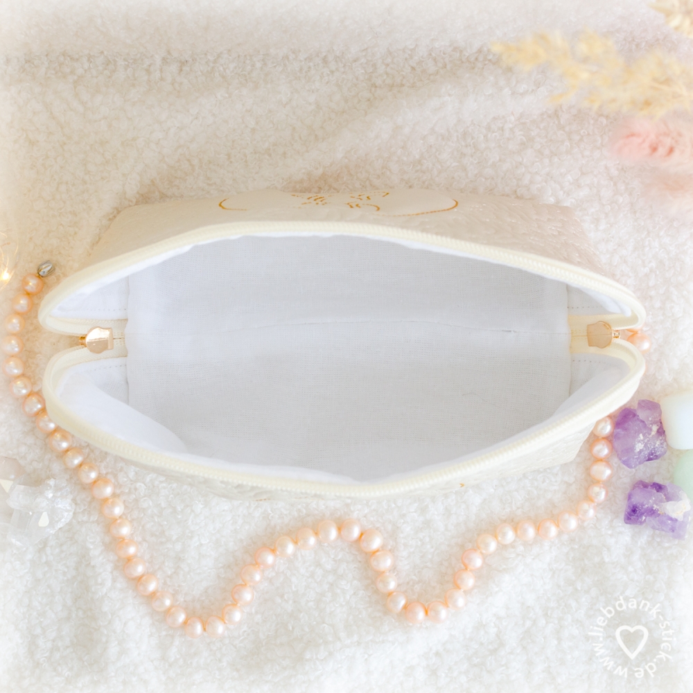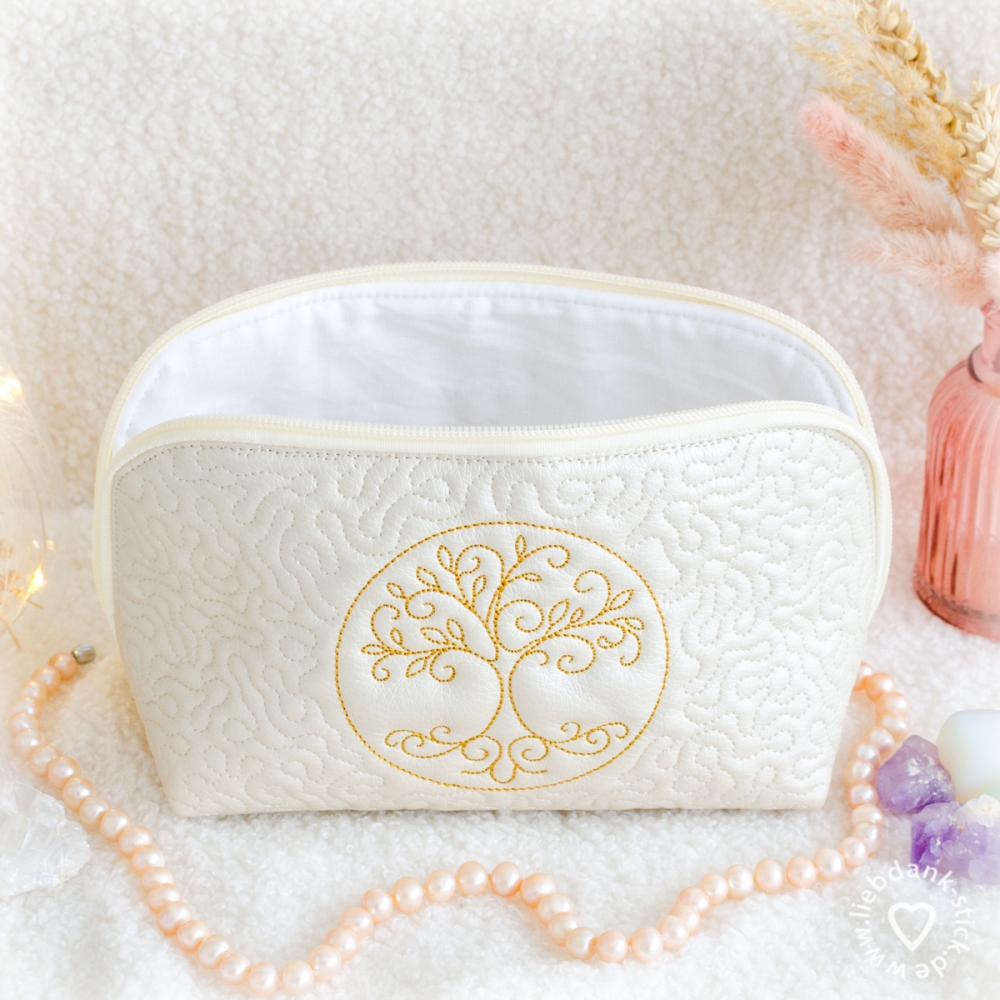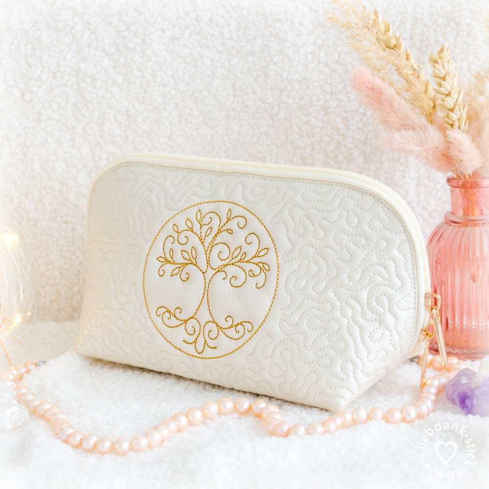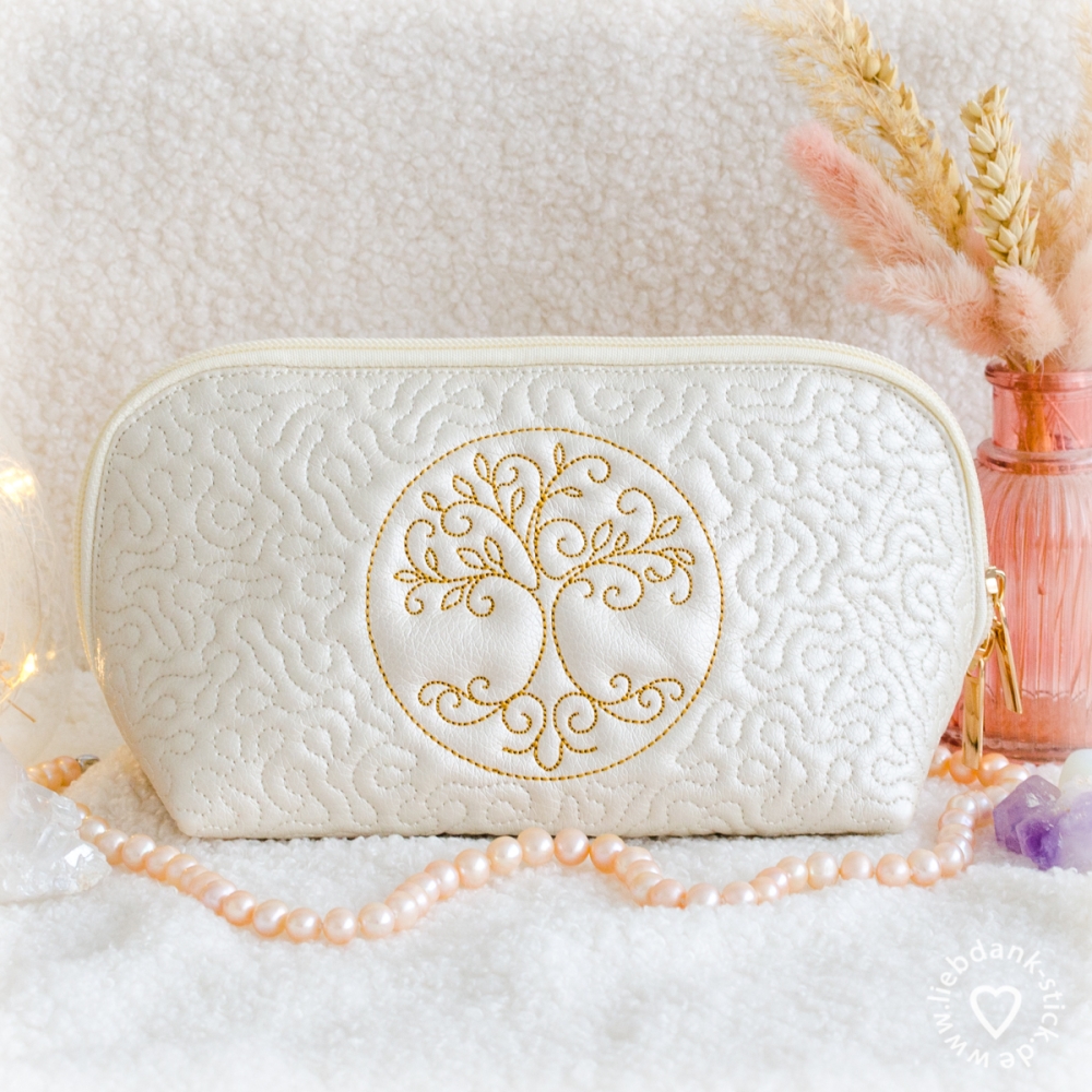 Diese hübsche Kosmetiktasche wird teilweise mit der Stickmaschine angefertigt und am Schluss mit der Nähmaschine genäht. Eine Schritt für Schritt Anleitung ist dabei.