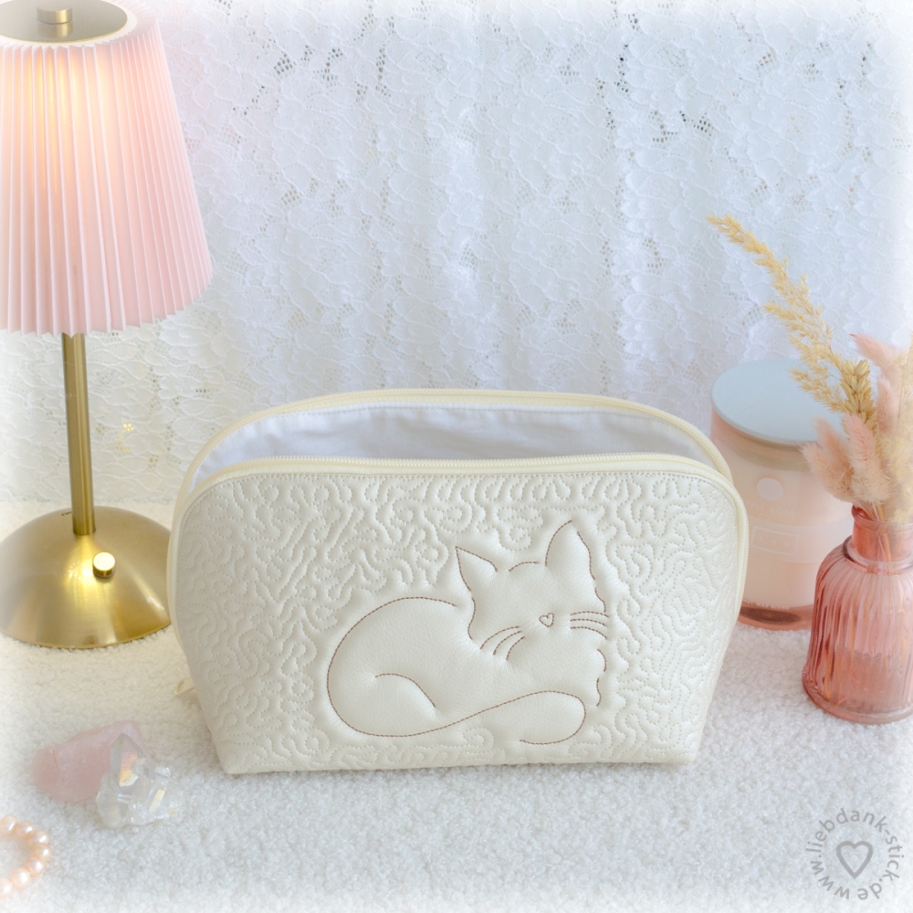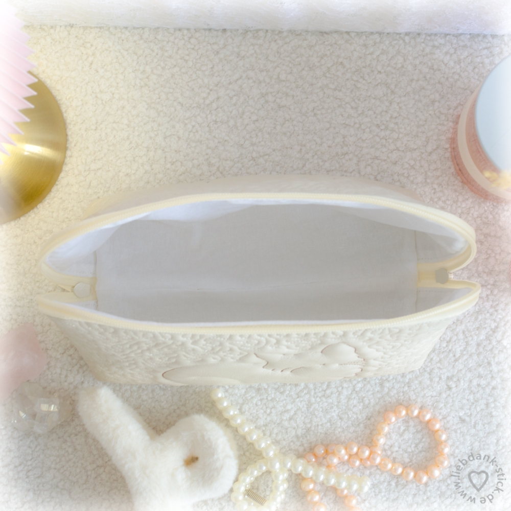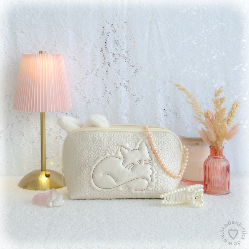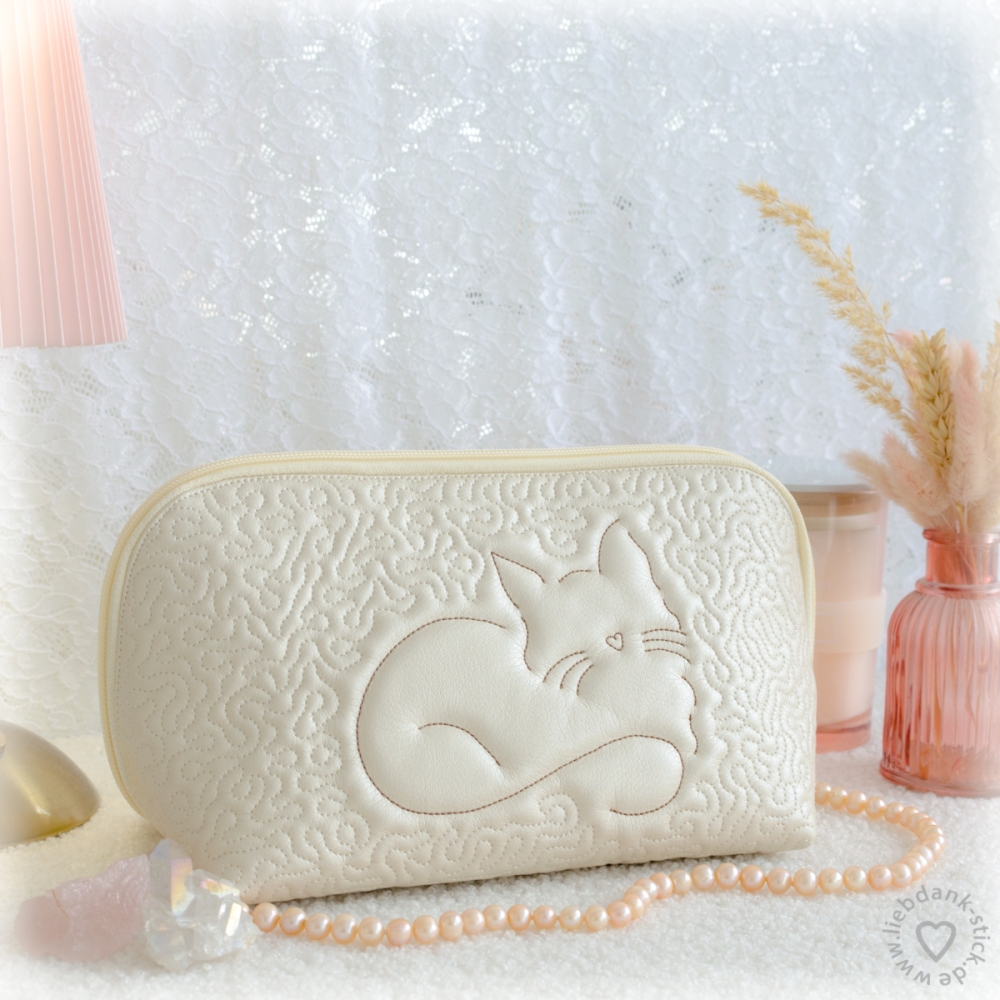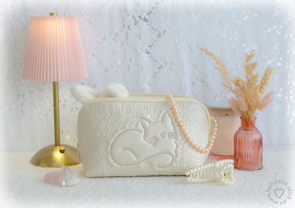 Diese hübsche Kosmetiktasche wird teilweise mit der Stickmaschine angefertigt und am Schluss mit der Nähmaschine genäht. Eine Schritt für Schritt Anleitung ist dabei.